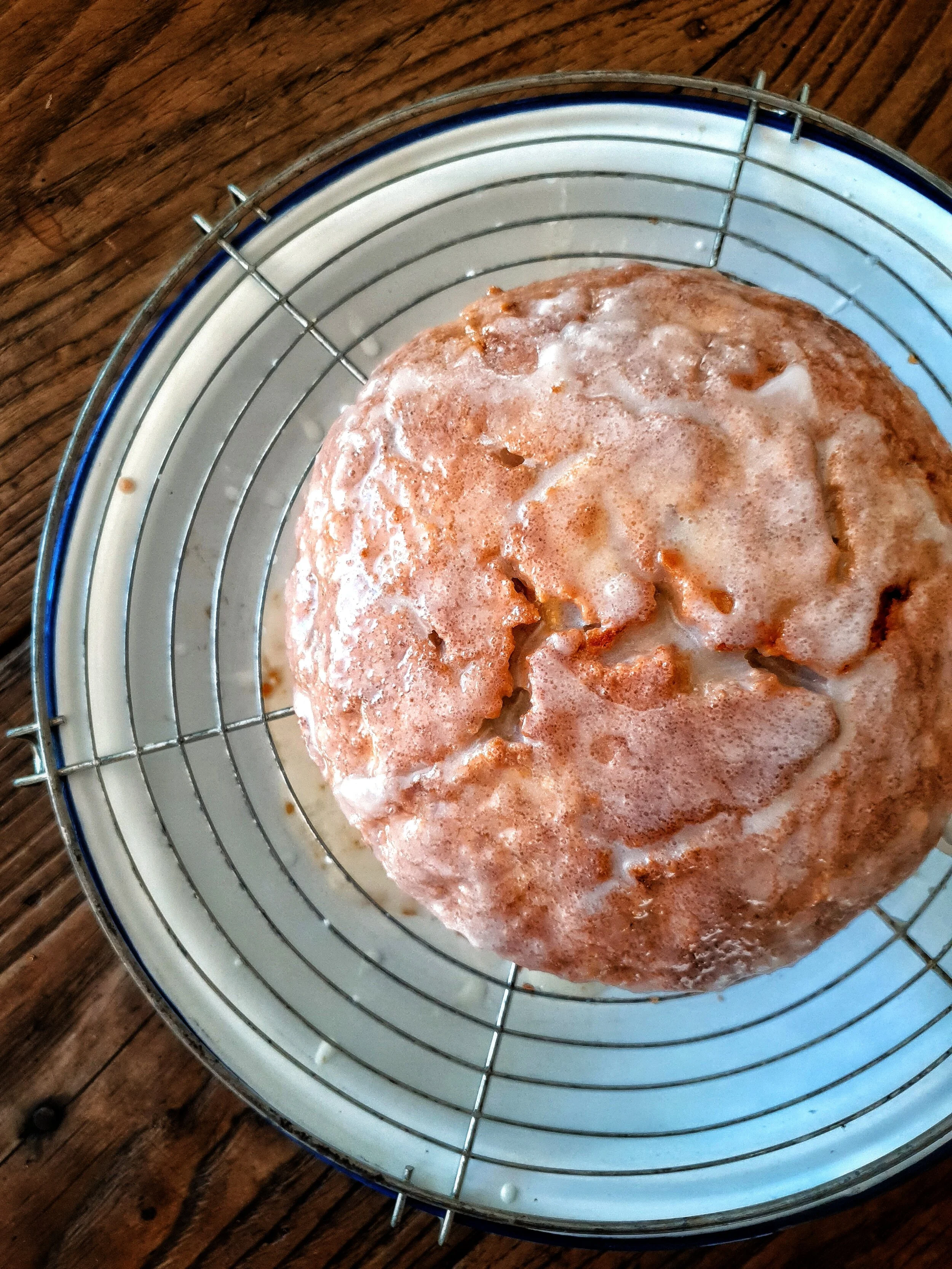 Let the cake cool down for 10 minutes, then carefully turn it down on a cooling rack. I used a large dish under the rack so I could easily brush the cake with the glaze while it’s still warm, like in the photo below. Wait that’s completely cold before moving onto a serving dish.
